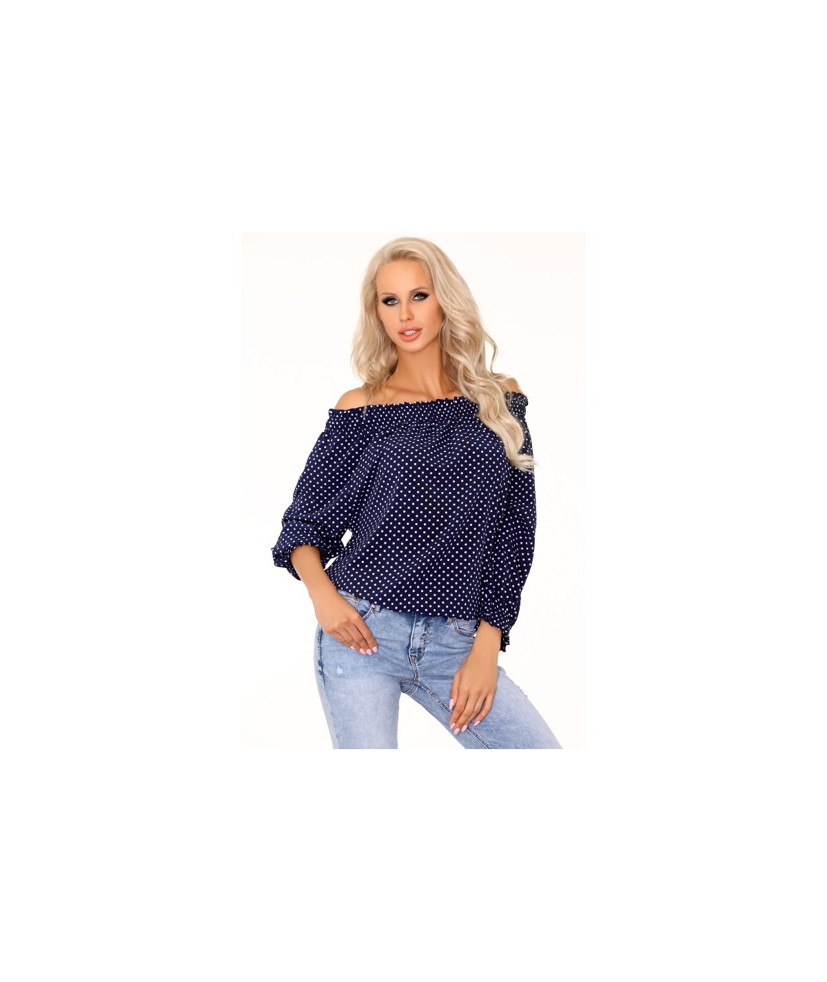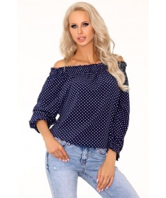 Ozdobna bluzka, z odkrytymi ramionami w hiszpańskim stylu, w pięknym granatowym kolorze, w białe kropki. Dekolt i zakończenie długich rękawów podkreślone elastycznym marszczeniem. Dół bluzki prosty.