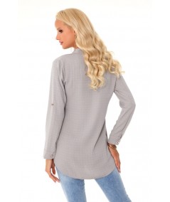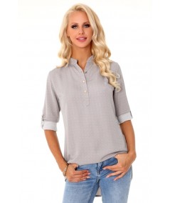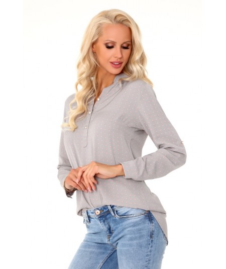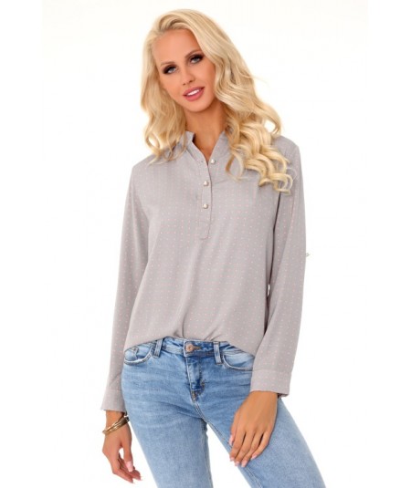 Niezwykle urocza bluzka w koszulowym stylu. Uszyta z miękkiego materiału, w jasnoszarym odcieniu z delikatnym nadrukiem w różowe kropki. Dekolt zdobi krótka pliska z guzikami i stójka. Długie rękawy z możliwością podpięcia, zakończone mankietem z ozdobnym guzikiem. Tył lekko przedłużony.